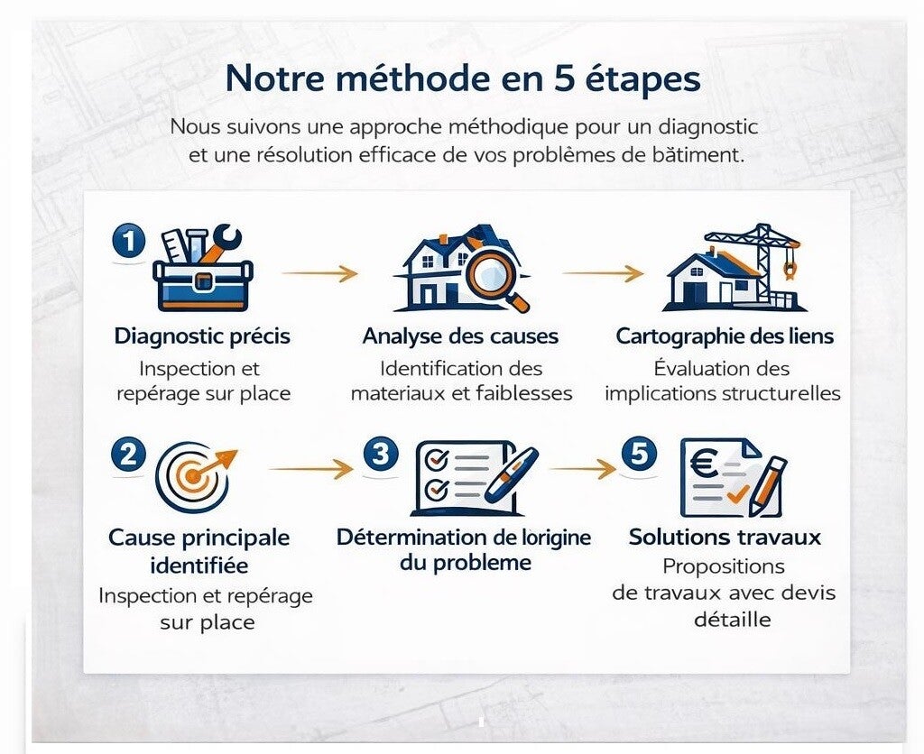 Pour tenir nos promesses, chaque intervention inclut une visite technique détaillée sur site. Nous réalisons une analyse approfondie des désordres, des relevés précis et un reportage photographique complet. Vous recevez ensuite un rapport d'expertise clair et argumenté, vous permettant de comprendre l'origine du problème et de défendre vos droits efficacement.